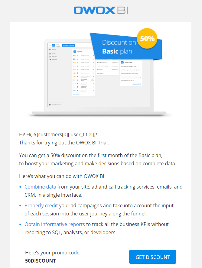 For email marketing to really help users go from acquaintance with a product to purchasing it, you’ll have to consider the user’s entire path through the funnel. This means you should work out questions and objections that may appear along the way to conversion. Remind visitors about abandoned carts, tell them how to set up your service, track changes in user activity, and change messages depending on the customer segment.