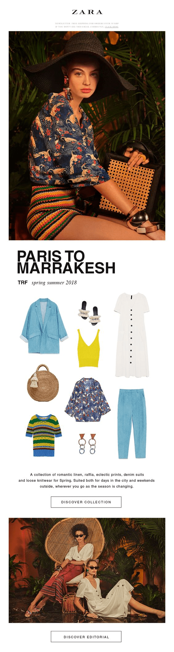 Zara uses informational content in its emails in the form of perfect fit suggestions and at the same time introduces new offerings. Right from the email, subscribers can immediately go to the store, where more special offers will be waiting for them.
