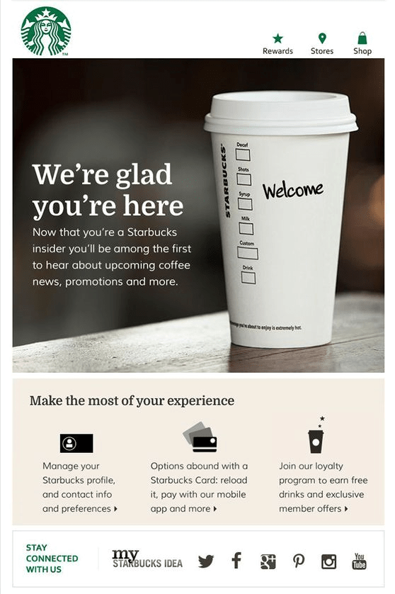 This type of welcome email tells the customer that you not only noticed their presence on the website but also are ready to continue your acquaintance and tell more about the opportunities you offer. Heat up the interest of the subscriber, gain their trust, and collect additional data. Such email can be complemented with useful, entertaining, and educational content. As a result, you’ll present your brand as a valuable resource and motivate the subscriber to stay in touch.
