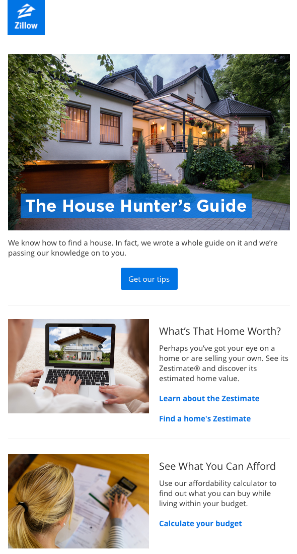 This email focuses on building relationships rather than making a sale. It offers subscribers a helpful, detailed guide with practical tips for finding a home. The text is concise and straightforward, with a headline that gets straight to the point — no fluff, just value.