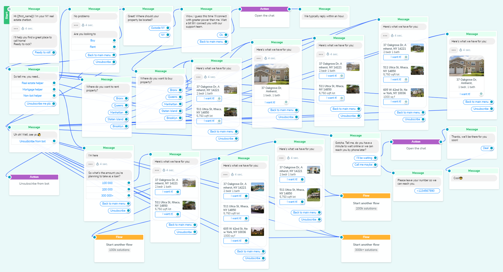 To launch your virtual worker with SendPulse, no code is needed. Just use our drag and drop builder. The platform provides guidelines on real estate chatbots and a ready-to-use template. This is how a real estate chatbot’s automated flow in SendPulse can look.