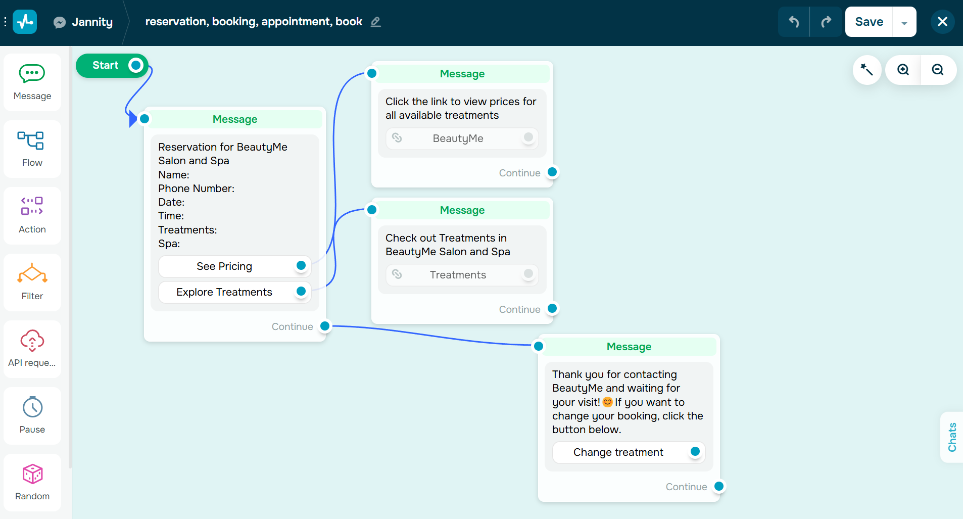 Below, you will find a flow created from scratch in SendPulse. It allows users to make a reservation.