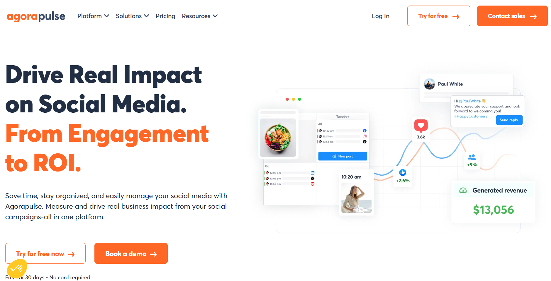 - paid plan: 5 social profiles, an all-in-one social inbox, a social content calendar, paid promotion tools to boost Facebook posts, and more for $199 per seat monthly if billed annually.