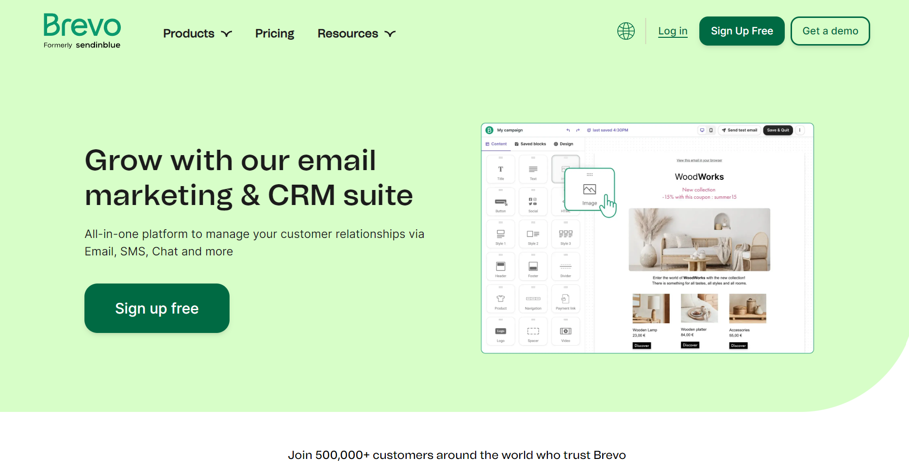 - free plan: 300 emails/day, customizable email templates, drag-and-drop editor, transactional emails, SMS and WhatsApp campaigns.